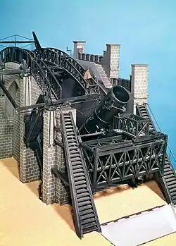 The tube is of the Newtonian design with the eyepiece on its western side. At low altitude, the observer accesses the eyepiece from a wooden gallery that spans the distance between the walls and can slide up and down guides to follow the telescope in altitude. A cage on the gallery moves sideways to reach the eyepiece at different azimuth. At high elevation, curved galleries on top of the western wall are used, which can be moved across the wall to follow the telescope in azimuth.[2][3]