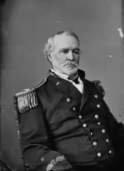 From 1840 to 1841, Powell was commanding officer of the brig USS Consort and surveyed the coast from the Appalachicola River to the Mississippi River.[1] In June 1843, Powell was commissioned as commander. From 1848 to 1849, he was Assistant Inspector of Ordnance in Washington, D.C.[3] In July 1849, Powell commanded the sloop-of-war USS John Adams. He was with the John Adams for one and a half years; sailing to Brazil and the African coast.[3][8] Powell then served as an executive officer at the Washington Navy Yard for three years.[3] Powell commanded the USS Potomac and was promoted to captain in September 1855. From 1856 to 1860, Powell was inspector of contract steamers.[3] During the American Civil War, Powell commanded the USS Potomac of the Union Navy, from August 20, 1861, to June 29, 1862. The Potomac was on blockade duty in the Gulf of Mexico. He was promoted to commodore in July 1866 and promoted again to rear admiral on the retired list in 1869.[3][1] He did not retire until 1872.[3]