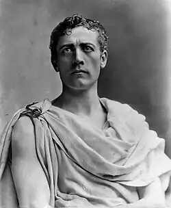 After acting in amateur performances, Waller decided to make a career on the stage and was engaged by J. L. Toole in 1883. His first role was the Hon. Claude Lorrimer in H. J. Byron's Uncle Dick's Darling, in which he was billed as "Waller Lewis".[4] By May of the same year, he had adopted the stage name Lewis Waller.[5] In that month he appeared at the Theatre Royal, Drury Lane, in a charity matinee for the Actors' Benevolent Fund with Toole's company and such contemporary stars as Rutland Barrington, Lionel Brough, Arthur Cecil, Nellie Farren, George Grossmith, Henry Irving and Ellen Terry.[6] He remained in Toole's company for a year, playing light comedy and juvenile parts. He joined a touring company, playing the central role, the blind Gilbert Vaughan, in Called Back by Hugh Conway, dramatised by J. Comyns Carr.[7] He returned to London in March 1885 to play at the Lyceum Theatre in Helena Modjeska's company, as the Abbé in Adrienne Lecouvreur, and then toured with her, playing such roles as Mortimer in Mary Stuart and Orlando in As You Like It;[7] The Manchester Guardian said of the latter that he "kept Orlando properly ingenuous, and made him a taking and gallant young wooer."[8]