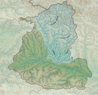 The Great Liakhvi (Georgian: დიდი ლიახვი Didi Liakhvi [ˈd̪id̪i ˈliäχʷi], Ossetian: Стыр Леуахи, Styr Lewakhi) is a river in central Georgia, which rises on the southern slopes of the Greater Caucasus Mountain Range in the de facto independent region of South Ossetia and flows into the Kura (Mtkvari). It is 115 km (71 mi) long, and has a drainage basin of 2,311 km2 (892 sq mi).[2] The cities of Tskhinvali and Gori lie along the banks of the Great Liakhvi. The river is mainly fed by the melting snows and glacier runoff of the Caucasus Mountains as well as by underground water sources. The Liakhvi reaches its highest water volume in the spring and summer while the lowest volume is recorded in the winter, when some segments of the river freeze over.