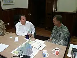 Fox voted for the 2003 invasion of Iraq. As Shadow Defence Secretary he supported the Government's position of maintaining British troops in Iraq until the security situation allowed for a withdrawal of troops but was critical of the lack of post-invasion planning and poor equipment initially provided to British troops.[16] He supported the idea of the American Surgel, believing that it was successful, and visited Iraq several times as Shadow Defence Secretary.[17]