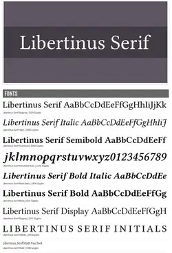 • Libertinus Serif: 6 serif typefaces cover three weights (Regular, Semibold, Bold) in each of two styles (Regular, Italic); originally forked from Linux Libertine.