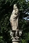 The three statues over the gateway are from the nearby ruined All Saints' Abbey and represent Saint Helena, above, Abbot Gerung, first abbot of All Saints, to the left, and his mother and the foundress of All Saints, the Duchess Uta of Schauenburg, to the right, who was a relative of the Margravine Irmengard.