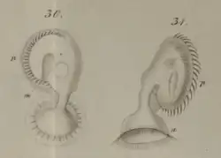 | Drawing of Licnophora (originally Trichodina) auerbachii by Cohn (1866), showing attachment disk (a), mouth (m), and adoral zone (p). | |