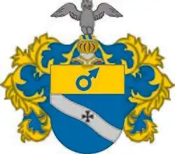 "...A shield, in the upper part (a chief) of gold, displaying a blue symbol of Mars. In the lower part of the shield, which is blue, a silver bend runs diagonally from the top right to the bottom left corner, overlaid with a black cross. The open barred helmet is crowned with a wreath twisted of gold and blue, upon which rests a forward-facing owl with outstretched wings, in its natural colours. The mantling is gold on the outside and blue on the inside, as shown with its proper and true colors in this depiction of the arms."[4]