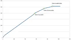 Instead, a common feature in Life without Death patterns is the presence of ladders, patterns that grow in a straight line. A ladder will grow forever unless it runs into some other part of the pattern and is blocked or unless some more quickly-growing pattern overtakes it. The most common ladder pattern is shown in the figure; every twelve steps, the same shape appears at the tip of the ladder, four cells farther from the starting position of the ladder.[4] The speed of the ladder's growth is therefore four cells per twelve steps, or, in Life notation, 4c/12 = c/3; here c represents one unit of distance per time step.[5] Another common pattern (called a "parasitic shoot" by Gravner and Griffeath[4]) advances twice as quickly, at speed 2c/3, along the side of a ladder, eventually blocking the ladder and causing a chaotic explosion.[4][6]