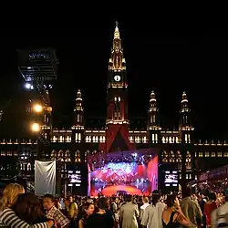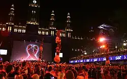 To ensure that the meaning of this major event is not forgotten, the opening ceremony on Vienna's city hall square includes moments of silence and speeches by international stars and partners, which focus on raising awareness for AIDS. Since the establishment of this society highlight, which has become a real tradition, numerous celebrities (designers, actors, musicians, politicians, and models) show their personal commitment to the issue with live performances and send a strong signal of solidarity. They make use of their popularity and position as role models for a good cause.[2]