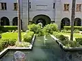 The building is an attraction in itself, centering on an open courtyard with palm trees and a stone arch bridge over a koi pond.