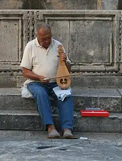 The lijerica is closely related to the bowed musical instrument lyra (lūrā) of the Byzantine Empire, an ancestor of most European bowed instruments and equivalent to the rabāb used in the Islamic Empires of that time. The Persian geographer Ibn Khurradadhbih (d. 911) of the 9th century, in his lexicographical discussion of instruments, cited the lyra as a typical instrument of the Byzantines along with the urghun (organ), shilyani (probably a type of harp or lyre) and the salandj.[3] The Byzantine lyra spread through Europe westward; in the 11th and 12th centuries European writers use the terms fiddle and lira interchangeably when referring to bowed instruments.[4] Over the centuries that followed, Europe continued to have two distinct types of bowed instruments: one, relatively square-shaped, held in the arms, became known as the lira da braccio (arm viol) family; the other, with sloping shoulders and held between the knees, was the lira da gamba (leg viol) group. During the Renaissance the gambas, were important and elegant instruments; they eventually lost ground to the louder (and originally less aristocratic) lira da braccio family.[5]
