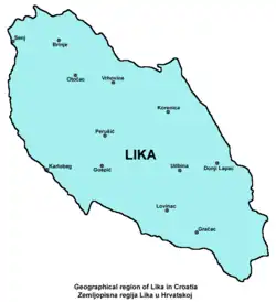 Lika (Croatian pronunciation: [lǐːka]) is a traditional region[2] of Croatia proper, roughly bound by the Velebit mountain from the southwest and the Plješevica mountain from the northeast. On the north-west end Lika is bounded by Ogulin-Plaški basin, and on the south-east by the Malovan pass. Today most of the territory of Lika (Brinje, Donji Lapac, Gospić, Lovinac, Otočac, Perušić, Plitvička Jezera, Udbina and Vrhovine) is part of Lika-Senj County. Josipdol, Plaški and Saborsko are part of Karlovac County and Gračac is part of Zadar County, and it takes up about 12% of Croatia's land area.