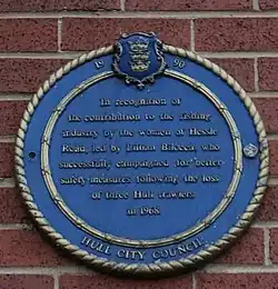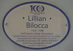 Bilocca has been described as a national figure and a local folk hero.[2] She was commemorated by a Hull City Council plaque in Hessle Road in 1990 that reads "In recognition of the contributions to the fishing industry by the women of Hessle Road, led by Lillian Bilocca, who successfully campaigned for better safety measures following the loss of three Hull trawlers in 1968"; another plaque in her honour is at the Hull Maritime Museum.[13] A mural on Hull's Anlaby Road painted by Mark Ervine and Kev Largey depicts Bilocca and her connections with the "headscarf revolutionaries" and the triple trawler tragedy.[11]