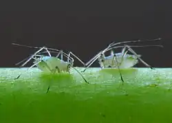 Reed aphids ingesting plant sap]] The Lily Mottle virus is transmitted during the feeding act of aphids (Aphididae). The aphids ingest the virus, which is present in high concentrations in the plant sap, during the feeding act and can infect other plants with a delay of a few hours. The virus cannot multiply in the aphid itself. After absorption of the plant sap into the aphid's midgut, the virus is distributed in the bloodstream and enters the saliva of the sucking apparatus; a new plant can then be infected during the next feeding. The aphid species that predominantly transmit LMoV are Aphis gossypii, Myzus persicae, Macrosiphum euphorbiae and Doralis fabae. Stored bulbs can also be infected with the virus by Anuraphis (Yezabura) tulipae.[15] Winged specimens of the aphid population enable transmission over long distances.