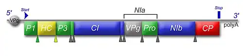 The genome of LMoV is a linear, single-stranded RNA with positive polarity [(+)ssRNA] and a length of 9644 nucleotides. A viral protein (VPg) is covalently bound to the 5'-end of the RNA. As with cellular messenger RNAs, a poly(A) tail of 20 to 160 adenosines is located at the 3' end of the viral genome. Between the two non-coding ends (NCR: non-coding region) is an open reading frame (ORF), which codes for a polyprotein of 3095 amino acids. This polyprotein is cleaved into the individual viral proteins by proteases during translation.