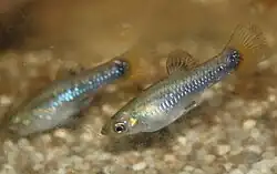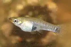 The male's caudal peduncle and dorsal fin are black, while the caudal fin is yellow with a black rim.[7] Male fish usually also have patches of black and sulfur-yellow scales on their heads, fins, and flanks.[6] Sexually mature females instead have a large bluish-black pigmented area around the gonopore called the gravid spot,[7] unique in the genus.[4] Such chromatic distinction from both males and juvenile females is unusual among female poeciliids.[7] Female fish grow to 5 cm (2.0 in) standard length,[8] while the males attain 4 cm (1.6 in).[9]