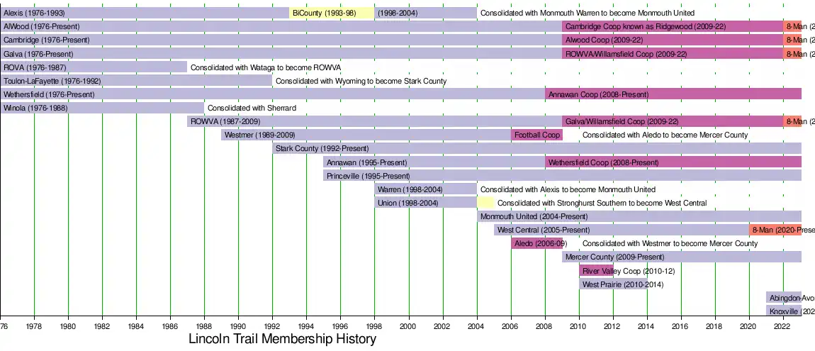 Wethersfield played an independent schedule that first season and its first full conference slate wasn't until 1977. In 1988 Viola-Winola closed and Joy-Westmer replaced them in 1989. In 1992 Toulon consolidated with Wyoming and became known as Stark County. Alexis left briefly in 1993 and Annawan and Princeville joined in 1995. In 1998 Alexis was back in along with newcomers Biggsville Union and Monmouth Warren. The league divided into two divisions with Cambridge, Galva, Wethersfield, ROWVA, Princeville and Stark County in the East, and Alexis, Annawan, Biggsville, Westmer, Warren and Alwood in the West. In 2004 Alexis and Monmouth Warren consolidated forming Alexis United, and Biggsville Union left the loop to coop with Stronghurst Southern and the division set up was dropped. In 2005 Oneida ROWVA and Woodhull-Alwood co-oped in football and Biggsville Union rejoined under the name of West Central having consolidated with Stronghurst Southern. Football was not a conference sport from 2006–2009. During that time the Lincoln Trail Conference was a component of the West Prairie Trail mega conference for football only. The components of the West Prairie Trail conference were the West Central Conference, Prairieland Conference and Lincoln Trail Conference. The Lincoln Trail may reform as a football conference moving forward with the following teams: Annawan/Wethersfield co-op, Cambridge/AlWood co-op, Galva/Williamsfield co-op, Mercer County, Stark County, Princeville, Sciota West Prairie, West Central, and the River Valley co-op (Henry, Low Point-Washburn, Midland) which is not a member for other sports.[7]