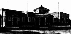 In late 1936 Scott was commissioned by the Municipality of Erskineville to design a new Town Hall for the small inner city council. Scott's initial design in the Mediterranean style was an ambitious one, including two stories and a 75-foot-high clock tower, echoing his design of the Freshwater Surf Life Saving Club the year before.[24] This design however was found to be too expensive and grand for a small municipality in a primarily working-class area of Sydney and was later revised to be a scaled down single-storey building without the tower in a similar red brick Mediterranean style.[25] Completed in 1938, the Town Hall was also featured in Building.[26] In 1939 Scott designed the Christ Church in Coonabarabran for the Anglican Diocese of Bathurst.[27][28][29]