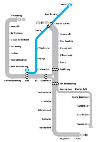 Metro Line 52 (Dutch: Metrolijn 52), also known as the North–South Line (Noord/Zuidlijn), is part of the Amsterdam Metro network. The line starts in Amsterdam-Noord (Noord station next to the Buikslotermeerplein), continues under Amsterdam-Centrum to its terminus in Amsterdam Zuid station. It has six intermediate stops: Noorderpark, Centraal Station, Rokin, Vijzelgracht, De Pijp, and Europaplein. The line was officially opened on 21 July 2018 by the mayor of Amsterdam, Femke Halsema[2] and was opened to the public on the next day, 22 July 2018.[3]