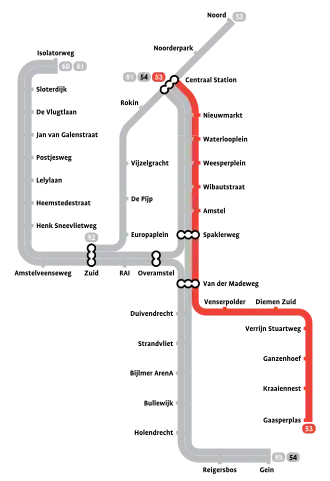Line 53 (Dutch: Metrolijn 53), also known as the Gaasperplas Line (Dutch: Gaasperplaslijn), is a line of the Amsterdam Metro system. It runs between Amsterdam Centraal in the city center and Gaasperplas metro station in the southeastern neighborhood of Bijlmermeer, a modernist planned community built around the metro line.[1] The line forms the eastern branch of the Oostlijn (East Line).