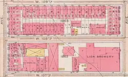 At its peak, the Lion Brewery occupied about six square city blocks, from Central Park West to Amsterdam Avenue and from 107th to 109th Street.[3][4] At the time Manhattan's Upper West Side was an open area with inexpensive land housing, many public institutions and an insane asylum. There were about five to ten thousand living in shanties after being displaced by the creation of Central Park in 1859. Consequently, with the brewery and surrounding areas, the Upper West Side failed to increase its real estate value until the early twentieth century. In 1862, a $1 tax on each barrel of beer hurt small brewers but not Lion. The anti-saloon movement in the late 19th and early 20th century encouraged Lion to clean up its own saloons.