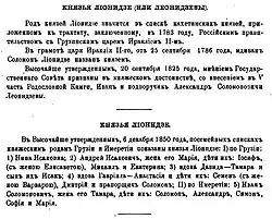 The family originated from the province of Kakheti and were elevated to the princely rank by King Heraclius II of Georgia in the mid-18th century. They were confirmed as the princes Lionidaev in Imperial Russia according to the decrees of 1825 and 1850.[1]