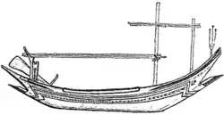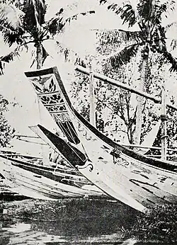 These boats come from varying size between 5 metres long to more than 10 metres. Usually the length is no more than 4 times the size of its mast.[4] The ribs are never excessive on the hull. The hull was held together by the boat's stempost in its tip, with hidden wooden dowel in the corner of the planks.[1] In the 19th century there are some models with outrigger, but now they are rarely seen.[1] The rigging used is the traditional triangular layar lete with short mast. At the stern of the boat is a wide storage space (about as wide as the boat itself), covered from rain by bamboo cover. A row of fire pots in this storage space supports the pots for boiling water. Firewood and fish were stored in the deckhouse. These perahu were lightly built so they may be fast, for carrying fish from mayangs in the Java sea.[5] Small lis alis is an open vessel, it doesn't have roofing.[6] Lis alis is a bifid-ended boat (with double stem and sternpost), the lower "jaw" called antek, cantek or jabaran is an elongation of the keel that functions as a bumper.[7]