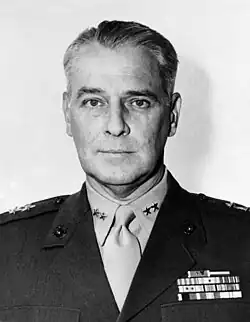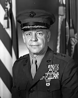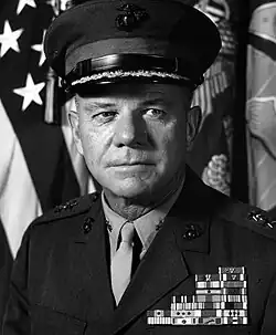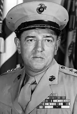 Veteran of Guadalcanal Campaign, Battle of Iwo Jima and Korean War; The 21st Commandant of the Marine Corps, also commanded 1st Marine Division or Marine Corps Reserve; Army Distinguished Service Medal, two awards of Legion of Merit with Combat "V", Purple Heart