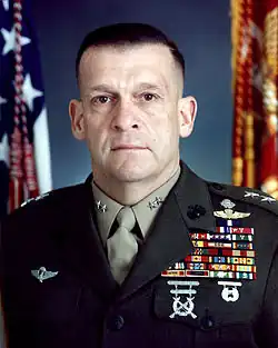 Veteran of Vietnam War and Gulf War; later served as commanding general of Marine Corps Combat Development Command at Quantico; Navy Distinguished Service Medal, two awards of Silver Star, Legion of Merit, Bronze Star Medal with Combat "V", Purple Heart