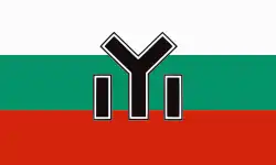 The Bulgarian flag with the lion on a red background in top-left corner and a green saltire on a white background in bottom-left corner.