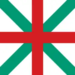 A square flag with a red and green cross in a white background.