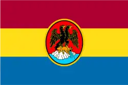 Variant of the state flag of the NDH | A variant of tricolour of red, white, and blue with the Ustaše symbol in top-left corner and the Croatian coat of arms in the center. The flag used Ustaše colors, proportions 2:5. | |