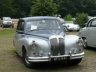 | DK400[20] | 1956–1960 | straight-6, 4617 cc | 95.2 | 108.0 | 132[note 8] | Renamed Regina with Carbodies standard steel limousine body,[26] last production Daimler car with fluid flywheel transmission[27] car illustrated has Hooper Empress limousine body |