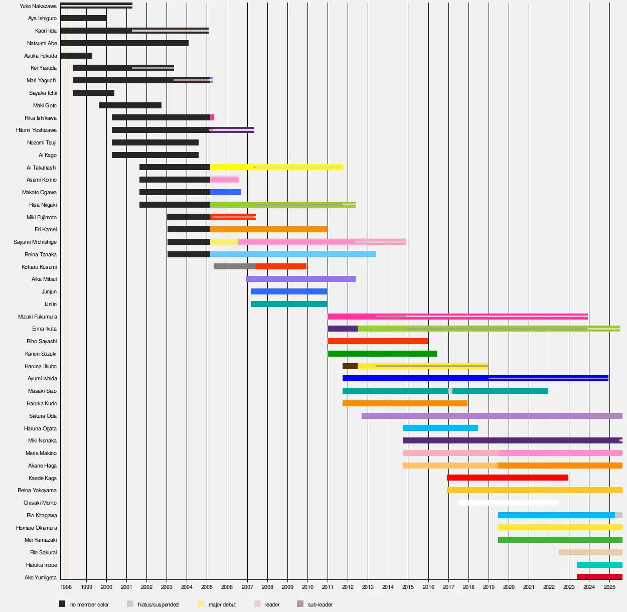 Morning Musume contains a leader and a sub-leader role, which consists of providing moral support to the group.[1] The sub-leader position was established on April 16, 2001, when Kaori Iida became the second leader.