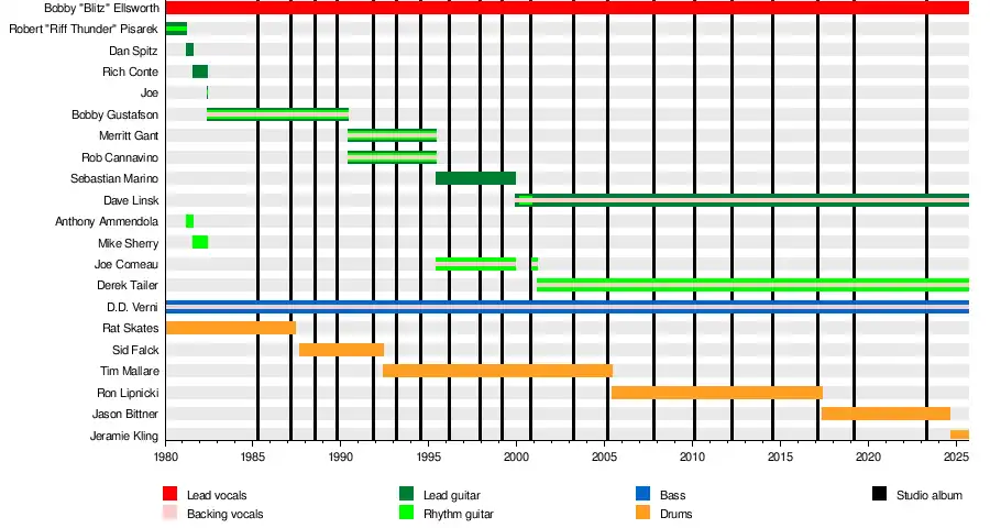 | Phil Demmel | 2021–2023 | Demmel played one show with Overkill in place of Linsk in November 2021, due to scheduling conflicts.[22] He continued to do so their 2022 spring tour with Prong. | ||