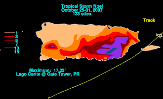 - October 26 - The precursor of Hurricane Noel dropped heavy rainfall across Puerto Rico for several days, leaving grounds saturated and causing surface runoff.[26] Precipitation peaked at 17.23 inches (438 mm) at Carite Lake.[27] Flash flooding was reported in Carolina, and a mudslide occurred in Utuado. Flooding occurred along several rivers, including the Río de la Plata, with a reading of 8.9 feet (2.7 m) above flood stage at Toa Baja reported late on October 27.[26] In response to high water levels, officials opened dam gates along the Río de la Plata and the Río Carraízo.[28] There were no official reports of fatalities.[29]