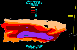 - October 5–8 Rain began to pour across several parts of Puerto Rico due to Hurricane Otto, persisting for up to five days in some areas. The greatest amount of rainfall during the six-day period of October 3 to 8 was registered at Rio Portugues in Ponce, with 17.86 inches (454 mm) recorded.[67] Subsequent widespread flooding affected at least 295 roads, 14 of which suffered significant damage. In all, damage to road infrastructure was preliminarily estimated at US$6.5 million.[68] In addition, the municipality of Ponce reported copious losses in agriculture, later estimated at US$1.5 million.[69]