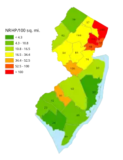The following are approximate tallies of current listings in New Jersey on the National Register of Historic Places. These counts are based on entries in the National Register Information Database as of April 24, 2008[2] and new weekly listings posted since then on the National Register of Historic Places web site.[3] There are frequent additions to the listings and occasional delistings and the counts here are approximate and not official. New entries are added to the official Register on a weekly basis.[4] Also, the counts in this table exclude boundary increase and decrease listings which modify the area covered by an existing property or district and which carry a separate National Register reference number. The numbers of NRHP listings in each county are documented by tables in each of the individual county list-articles.