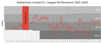 As of the end of 2022–23, the club's first team has remained in the English Football League since its formation.[3] Their highest finish came in 1954–55 when they finished in third place in the Second Division, missing out on promotion to the top division only on goal average.[1] In total the club has spent 27 seasons in the second tier of the English football league system, 47 in the third and 13 in the fourth. Rotherham has qualified for four Football League play-offs, in 1998–99 they lost in the Third Division semi-final to Leyton Orient,[5] in 2009–10 they reached the League Two final but lost 3–2 to Dagenham & Redbridge,[6] in 2013–14 they reached the League One final and defeated Leyton Orient in a penalty shoot-out to gain promotion the Football League Championship,[7] and in 2017–18 they again reached the League One final and defeated Shrewsbury Town 2–1 to gain promotion the EFL Championship. The table details their achievements in first-team competitions for each completed season since their first appearance in the Football League in 1925–26.