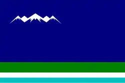 A flag consisted of four horizontal stripes : light blue (3/4 of the flag's width), white (1/16), red (1/16), and green (1/8). The blue stripe is charged with a white disc in the center, 2/5 of the flag's width.[1]