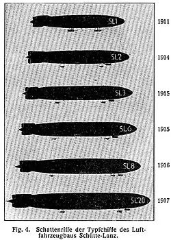 Schütte-Lanz (SL) airships were a series of rigid airships designed and built by the Luftschiffbau Schütte-Lanz company from 1909 until 1917.[1] One research and four passenger airships were planned for post-war use, but were never built. The Schütte-Lanz company was an early competitor of the more famous airships built by Ferdinand von Zeppelin.[2] It is common for all rigid airships to be informally called zeppelins regardless of their manufacturer, and Schütte-Lanz airships are often referred to as such, but the Zeppelin name technically only applies to those manufactured by the Zeppelin company.