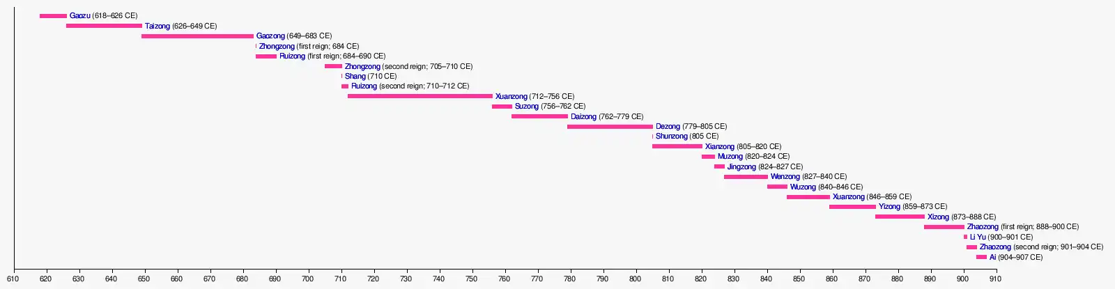 - Twitchett, Denis (1979). "The T'ang emperors and their reign periods". The Cambridge History of China. Vol. 3. Cambridge University Press. ISBN 978-0-521-21446-9.