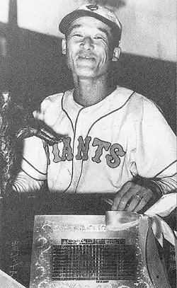The Giants dominated the Japanese Baseball League.[4] The team won nine championships in sixteen seasons under five different managers. Sadayoshi Fujimoto, the team's first manager, held the position for ten seasons and has the highest winning percentage of any Giants manager.[3] Hideo Fujimoto was a player-manager from 1944 to mid-1946, however the 1945 season was cancelled because of World War II.[3][4]