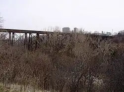 - 2 bridges – steel plate bridge over Eglinton Avenue East at Leslie Street and a long steel trestle over Don River and E.T. Seton Park south of Eglinton Avenue East and just east of Leslie Street ending just north of Wicksteed Avenue