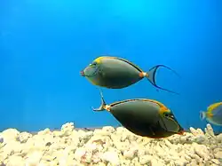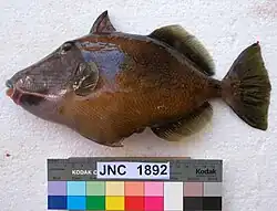 - Sufflamen chrysopterum (native), halfmoon triggerfish
