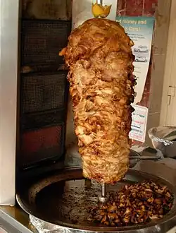 Introduced to Athens in the 1950s by immigrants from Turkey and the Middle East. Thin portions are shaved off and often served in a pita bread with onion. tomato, fried potatoes and Greek tzatziki sauce |