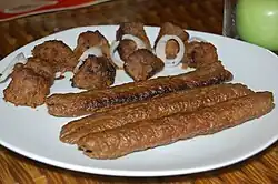 | Kabab kordi (کبابِ کُردی, lit. 'Kurdish kebab') | Ground lamb or beef, onions, garlic, and tomatoes | |