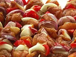 This is a list of kebab dishes from around the world. Kebabs are various cooked meat dishes, with their origins in Middle Eastern cuisine and the Muslim world. Although kebabs are often cooked on a skewer, many types of kebab are not.[1][2][3]