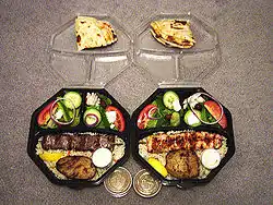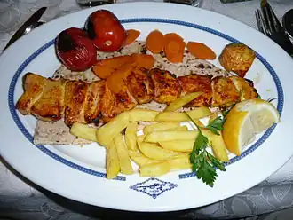 Skewers consisting of pork, chicken or lamb that is barbecued.[8][9] Pictured is a souvlaki platter. |