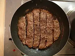 Ground beef or lamb (usually sirloin), often mixed with parsley and chopped onions. The mixture is formed into a flat stripped and grilled on extra-wide skewers. |