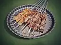 A Southeast Asian dish consisting of diced or sliced meat, skewered and grilled over a fire, then served with various spicy seasonings. It was developed by Javanese street vendors as a unique adaptation of Indian kebabs.[63][8] |