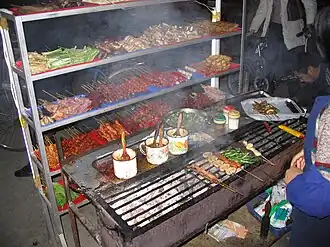 Similar to Chuanr, it is predominantly found on busy Chinese streets and night markets as a street food sold in food stalls and is a type of xiaochi. In China and elsewhere, such as in the United States, diners sometimes also order beer as an accompaniment. Shaokao typically consists of heavily spiced, barbecued foods on skewers. It is available in almost all of the cities in China, and is a prominent dish in Beijing, China, where some restaurants set up food stalls outdoors to purvey the product.[5][6] |